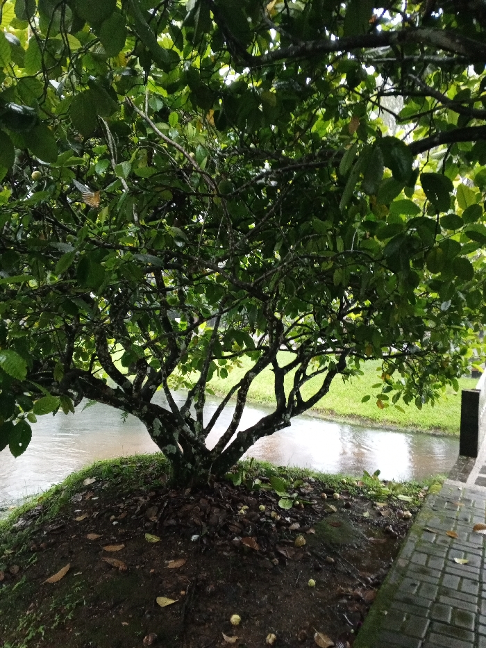 A tree with dense green foliage stands by a stream. Its multiple branches spread out from a thick, gnarled trunk, some touching the water. Leaves cover the ground at the base of the tree, alongside small, round fruits. To the right, a brick pathway leads away from the scene, partially visible in the foreground. The scene appears to be wet, potentially from recent rain.