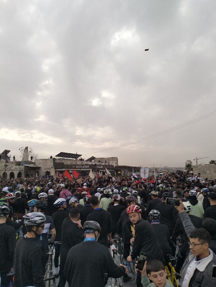 A large crowd of people, many wearing helmets, gathers in an outdoor setting. Most of the individuals are clad in dark clothing. Some are holding bicycles. Red flags and banners are visible in the background, with buildings and structures behind them. The overcast sky adds to the somber atmosphere. A drone hovers in the upper center of the frame. Some individuals are capturing the scene with their phones.