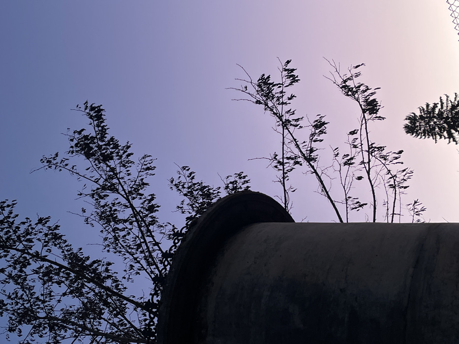 The image depicts a twilight scene in Meisenheim, Germany. A large, dark, cylindrical concrete-like structure, possibly a tower or silo, occupies the left side of the frame, extending from the bottom left corner upward and curving to the right at its top. Its upper rim is adorned with a dark, ornate, decorative iron railing or coping. Above and to the right of this structure, silhouetted branches of a deciduous tree with sparse foliage are prominent against the sky. The sky transitions from a deep blue at the top to a purple and then a pinkish-purple hue towards the lower right. In the lower right quadrant, a distinct conifer tree stands in silhouette, and a section of a chain-link fence is faintly visible in the extreme bottom right corner. No individuals, direct actions, or interactions are observable.