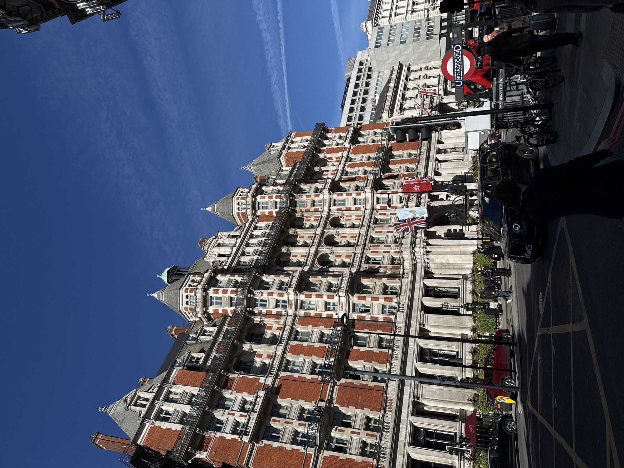 The image displays a sunlit street scene at Oxford Circus Station in London, United Kingdom. The primary subject is a grand, multi-story building, likely The Langham London hotel, featuring a red brick and white stone facade, multiple turrets, gabled roofs, and decorative balconies with wrought iron railings. Several flags, including the Union Jack, are displayed from the building's lower levels. On the street, multiple vehicles are present, including black London taxi cabs, a red SUV with a visible yellow 'P' plate on its rear, and a black sedan. Traffic lights are illuminated. The entrance to Oxford Circus Underground Station, marked by the iconic red "UNDERGROUND" roundel and "OXFORD CIRCUS STATION" text, is visible on the right, partially obscuring a red double-decker bus. Bicycle stands with several bicycles are located near the station entrance. Numerous pedestrians are seen walking on the sidewalks and crossing the street, casting distinct shadows. The sky is clear blue with some visible cirrus clouds or contrails. The overall scene depicts a busy urban environment on a bright day.