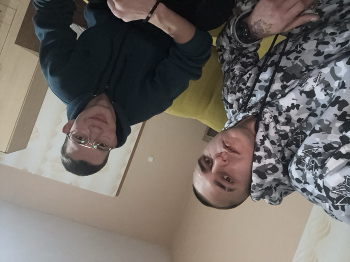 This image depicts two young adult males indoors, seated on what appears to be a chartreuse-colored sofa. The specific location within Shumen, Bulgaria, cannot be determined from the visual evidence, but the setting is consistent with an indoor residential environment. The male on the left has a shaved head and a neutral expression, looking directly at the camera. He wears a grey, black, and white camouflage-patterned hooded sweatshirt. Tattoos are visible on his right forearm, and a ring is present on his right ring finger. The male on the right has short hair, wears gold-rimmed eyeglasses, and a dark blue or teal hooded sweatshirt. He displays a faint smile and a dark beaded bracelet on his left wrist. Both individuals appear to be looking towards the camera, suggesting a selfie-style photograph. The background consists of a light-colored wall, partially adorned with patterned wallpaper on the upper left side. A light-colored wooden cabinet or wardrobe is partially visible on the right side of the frame. The room is illuminated by artificial light, providing relatively even lighting for the subjects.