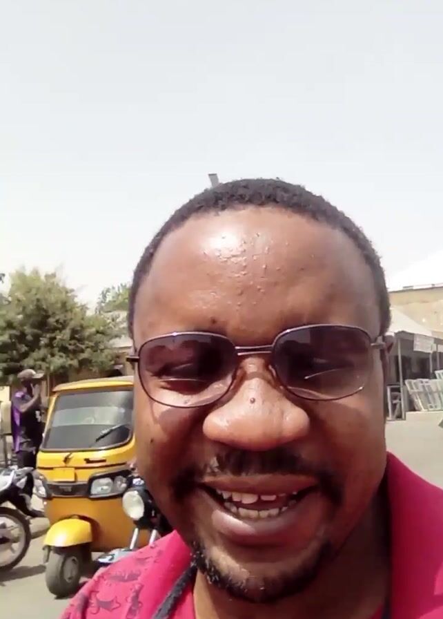 A man with dark skin, a trimmed beard, and glasses, wearing a red patterned shirt, stands on a street with buildings and vehicles visible in the background. He is smiling and talking to the camera. The weather is bright and sunny. The camera appears to be handheld. The background features a variety of commercial buildings, parked motorcycles, and posters on buildings. Traffic noise is audible.