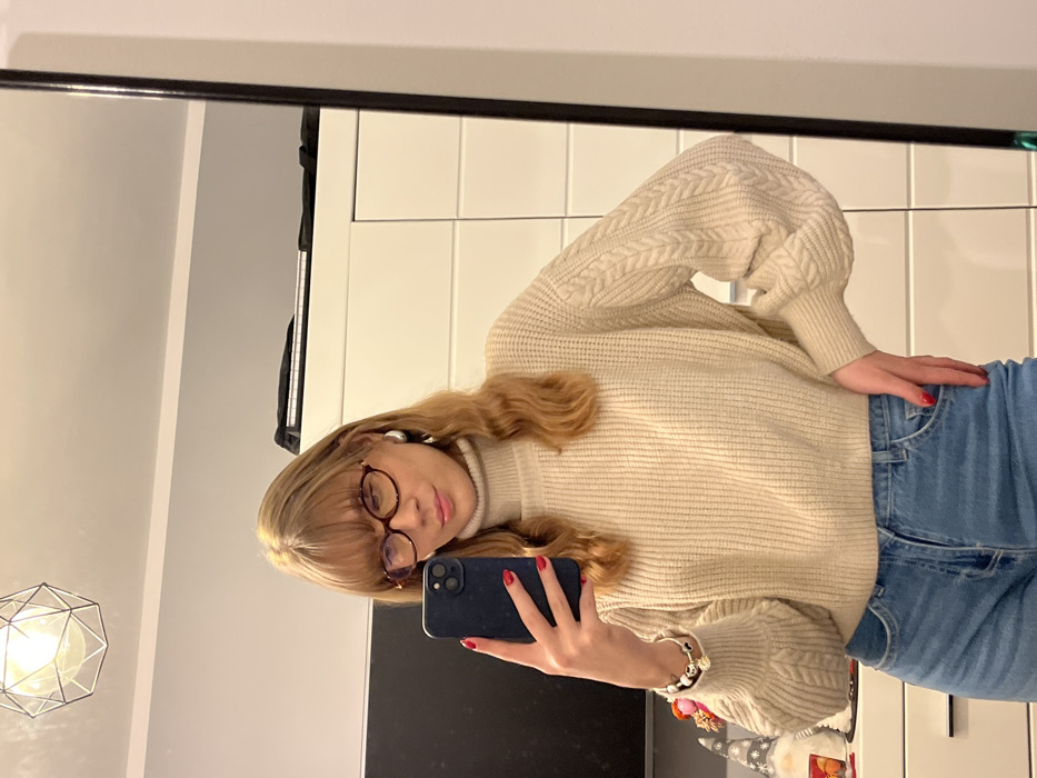 A young woman poses for a selfie in a mirror. She wears round glasses, a cream-colored turtleneck sweater with cable-knit sleeves, and blue jeans. Her blonde hair is styled with bangs. She holds a dark-colored smartphone in her right hand. A light fixture with a geometric design hangs from the ceiling. The reflection includes a white wardrobe and other room elements.