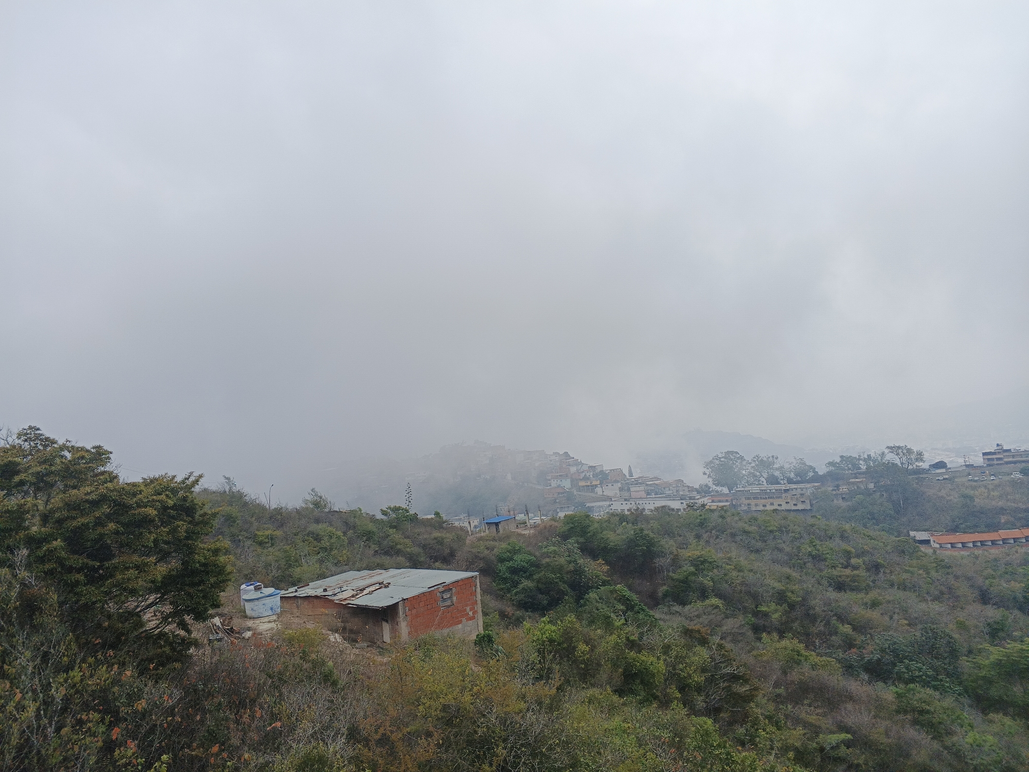 The scene is a hilly landscape, likely in a city due to the presence of buildings and structures in the background. The foreground is characterized by dense vegetation with trees and shrubs. A small, derelict building with a partially collapsed roof is situated prominently in the lower-left to center area. Above this, the landscape extends into the mid-ground, where one can observe more buildings, some appearing residential. These structures suggest an urban environment. The background is heavily obscured by fog, creating a sense of distance and adding an element of mystery to the scene. The weather condition is overcast, contributing to the dull lighting across the landscape. There are no people visible in the frame.