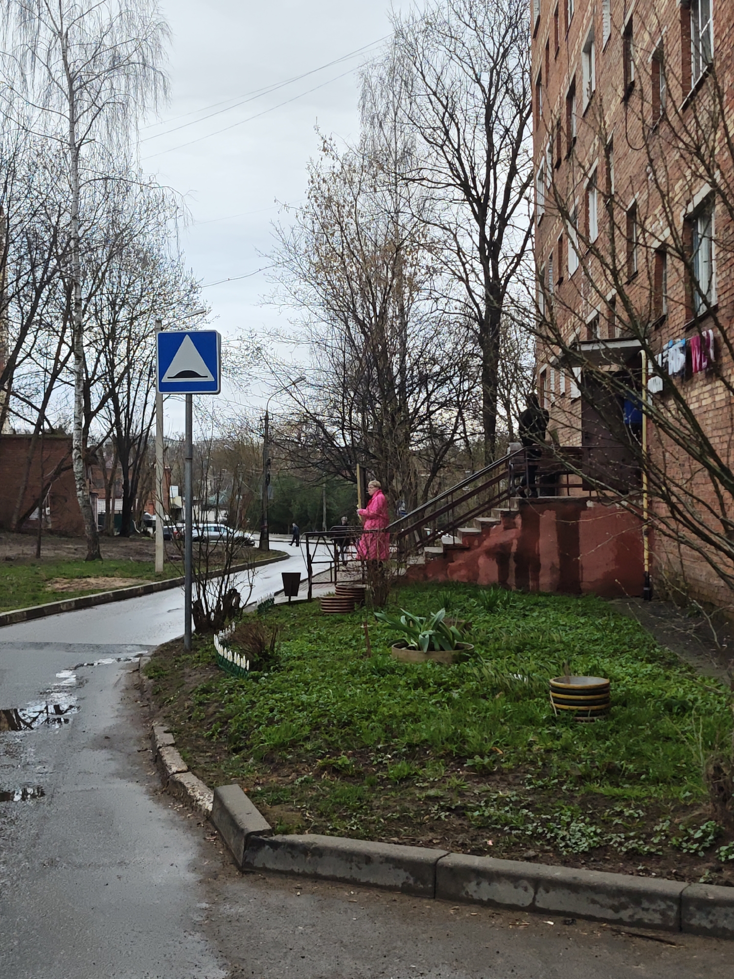 The scene is in Yakhroma, Russia, on a wet day. The camera is positioned on a paved street corner with puddles present. A blue and white traffic sign warning of a speed bump stands on the corner. Behind the sign, a red brick building with multiple windows and a raised porch is visible. Clothes are hanging on a line outside the building's entrance. Two people are standing on the porch, and a woman in a pink coat is standing on the steps leading up to it, holding a long object that could be a stick. A small garden with green plants is located in front of the porch. There are bare trees surrounding the buildings, indicating it is likely early spring or late autumn. Cars are parked along the street in the background.