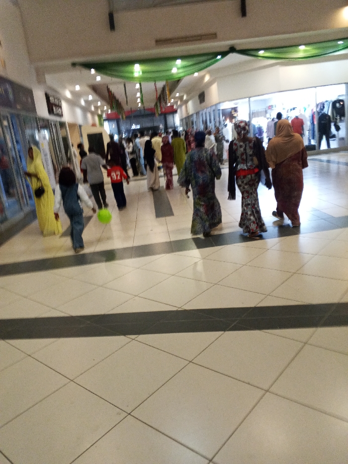 A shopping mall hallway is filled with people. Many are wearing traditional dresses. A child kicks a green ball. Decorations hang from the ceiling. Shop windows are visible on both sides of the hallway. The floor is tiled in a light color with dark diagonal stripes.