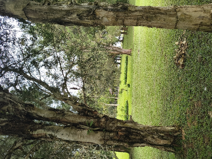 A lush green field stretches between large trees. The bark of the trees is textured and light in color, with some moss or small plants growing on the trunks. The lawn is well-manicured, and some fallen leaves gather near a tree trunk. More trees are visible in the background, indicating a park or wooded area. The scene has a tranquil, natural feel.