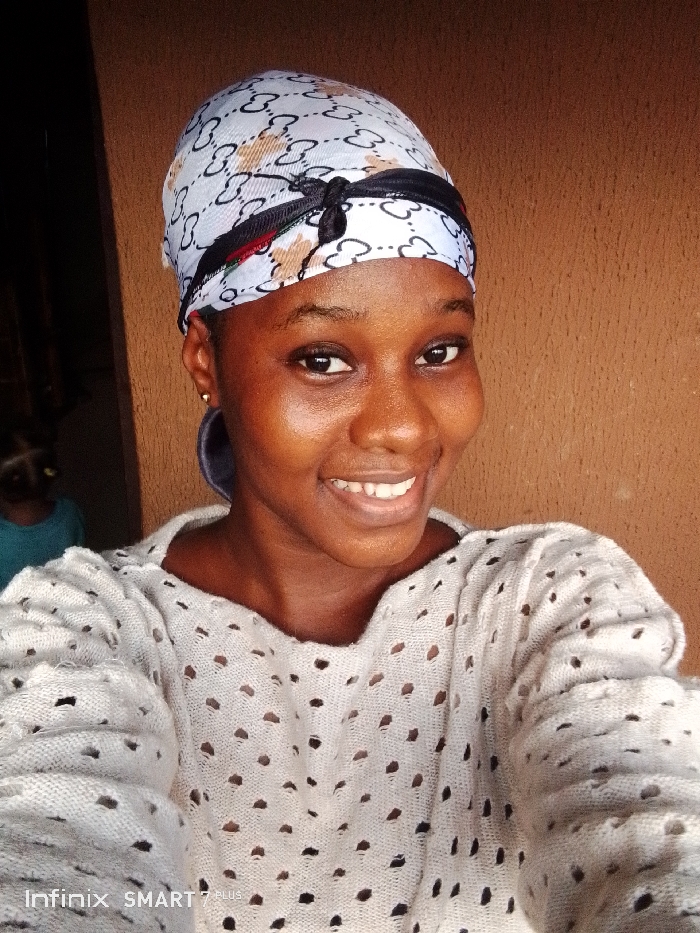 A young woman smiles at the camera. She has smooth, brown skin and is wearing a patterned headscarf with a black band. A white, loosely knit sweater covers her shoulders and chest. She has small gold earrings and a visible blue earring. The background consists of a plain brown wall, with a dark doorway to the left. Part of a small person wearing a blue shirt is visible through the doorway. The “Infinix SMART 7 Plus” watermark is in the lower-left corner.
