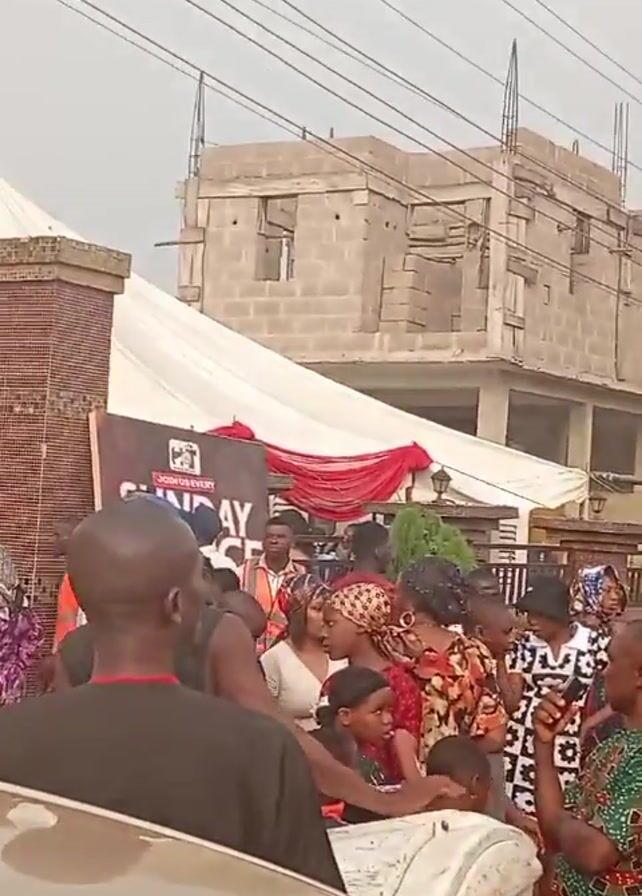 A daytime outdoor scene captures a crowd of individuals gathered near a white tent, seemingly participating in an event. A partially constructed building is visible in the background. The crowd consists of people of various ages and attire, with some wearing traditional African clothing. Interactions within the crowd are evident, with people talking and gesturing. A vehicle is parked in the foreground, partially obscuring the view. Overhead power lines are also visible.