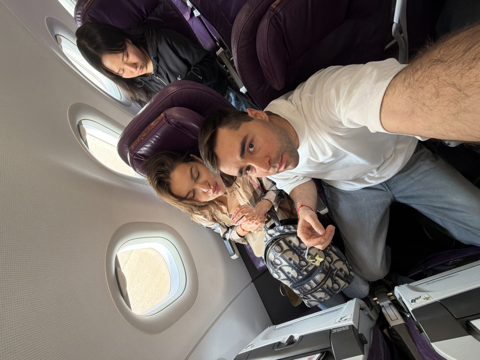 A selfie captures three individuals on an airplane with purple seats. Two women appear to be asleep; one is seated near the window, and the other is behind and above. The selfie-taker, a man wearing a white shirt and jeans, looks directly at the camera. A backpack rests on the woman's lap near the window. The interior of the airplane, including a window with bright light outside, is visible.