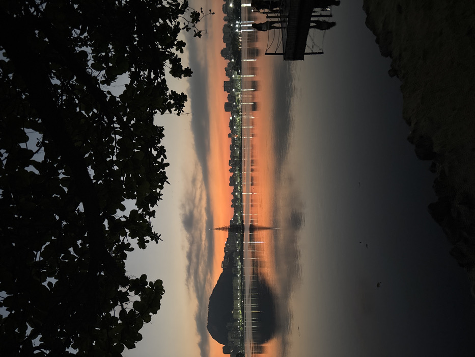 A body of water reflects an orange sunset sky dotted with buildings. A mountain or large hill looms in the distance. A silhouette of tree branches frames the left side. A dock-like structure appears on the right edge of the water, and the shoreline continues along the right. The image is oriented vertically.