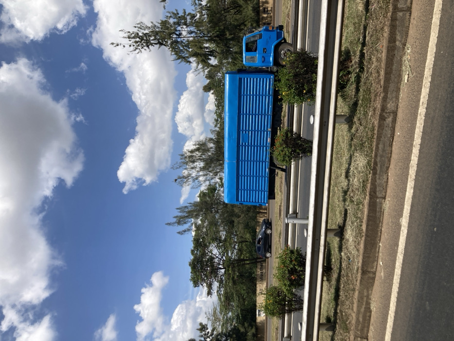 The image displays a clear, sunny day in Theta ward, Kenya, featuring a multi-lane asphalt road with vehicles and vegetation. In the foreground, a concrete curb transitions to a strip of dry grass, bordered by a silver metal guardrail equipped with three white reflective caps. Behind the guardrail, a median strip contains dry grass and three small, bushy green shrubs, two of which exhibit orange blossoms. On the road, a bright blue box truck, characterized by a blue cab and a horizontally ridged blue cargo container, is visible moving from left to right in the lane closer to the viewer. Further to the left on the same road, a dark-colored hatchback car also travels from left to right. A faint, partial white sign bearing the text "All Weather" is discernible behind the car. The background consists of a dense arrangement of various green trees, including taller, slender coniferous trees. A street light pole is visible amidst the foliage. The sky is bright blue, dotted with numerous large, white cumulus clouds.