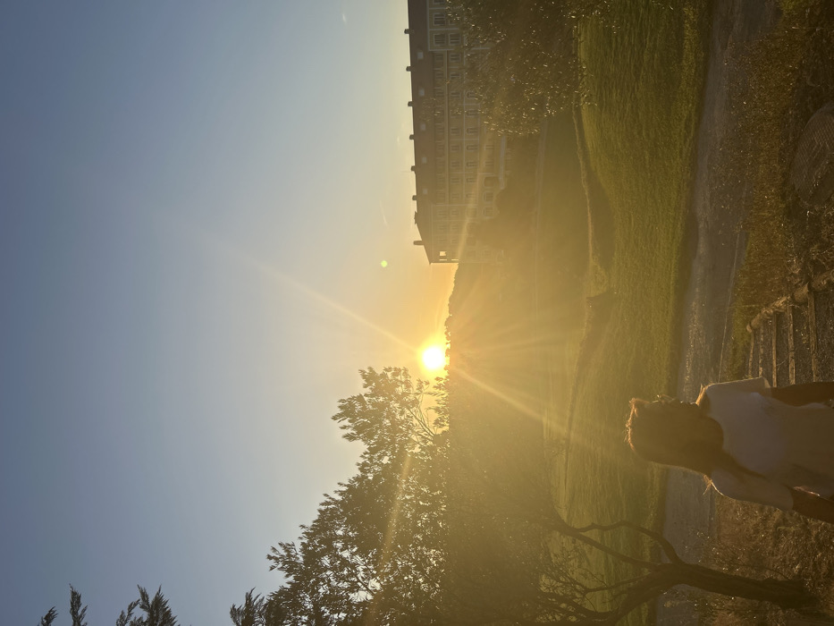 A panoramic view at sunset in Torres Vedras, Portugal, captures the Dolce by Wyndham CampoReal Lisboa resort building in the background. The sun, a bright golden orb, is positioned slightly left of center near the horizon, casting strong lens flare and illuminating the scene with warm, golden light. The sky above is clear and light blue, transitioning to a golden hue near the horizon. In the foreground, a single individual, an adult female with light brown hair and sunglasses, is partially silhouetted and stands to the left. She wears a light-colored t-shirt and is oriented to her left, looking towards the setting sun and the resort. Below her, a path with visible wooden sleeper steps extends into the lower right of the frame. The mid-ground and background feature a landscaped environment with rolling green grass, suggestive of a golf course or manicured parkland. Various trees and bushes are scattered throughout the scene, with one prominent tree branch visible in the upper left corner and another tree near the foreground subject. The Dolce by Wyndham CampoReal Lisboa building, a multi-story structure with multiple dormer windows and balconies, is situated on an elevated area in the background, right of center. The overall lighting indicates late afternoon or early evening.
