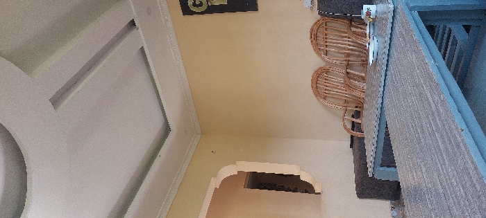 This image depicts an indoor or semi-covered area within Mosop ward, Kenya. The scene shows a room with light yellow-beige walls and a white ceiling featuring decorative molding, including a prominent curved element and rectangular recessed sections. White crown molding runs along the wall-ceiling junction. An arched opening or niche is present on the left wall, leading to a darker space beyond. In the mid-ground, two light-colored, possibly rattan or wicker, high-back chairs are positioned against the back wall. To their left, a section of a dark gray upholstered bench or low sofa is visible. In the foreground, two rectangular tables with textured, possibly corrugated, gray tops and light blue-gray frames are arranged. The closer table is larger and positioned slightly lower than the one behind it. On the upper table, two white shallow bowls and a white mug with a floral pattern (red and yellow details) are present. On the right wall, a dark rectangular sign with light-colored, partially visible lettering (beginning with "G") is mounted. No individuals are present in the image.