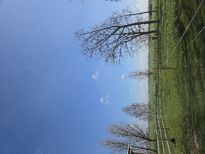 The image displays a panoramic view of an agricultural field located in Eeklo, Belgium, under a clear, bright blue sky. A single, faint aircraft contrail is visible diagonally across the upper-right quadrant of the sky, accompanied by two small, white cumulus clouds. The foreground and mid-ground are covered in vibrant green grass, consistent with a pasture, interspersed with numerous bare deciduous trees, suggesting late winter or early spring foliage. The field is sectioned by multiple white electric fences, composed of tape-like material strung between light-colored wooden posts. A dark, cylindrical object, potentially a battery or fence energizer, rests at the base of a fence post on the far left. A partial wooden structure, possibly a shelter or outbuilding, is visible at the extreme left edge of the frame. The distant horizon reveals a flat landscape with indistinct outlines of what appears to be urban or rural structures. No individuals or animals are present.