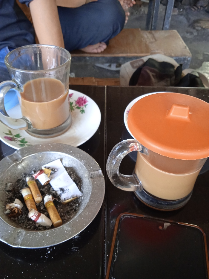 A table displays two cups of coffee, one with a lid and the other on a saucer adorned with floral patterns. An ashtray overflowing with cigarette butts and ash sits nearby. A smartphone rests on the table's edge. Part of a person is visible in the background, wearing blue jeans and sitting on an elevated surface.