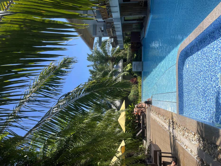 A sideways view captures a bright, sunny day at a tropical resort