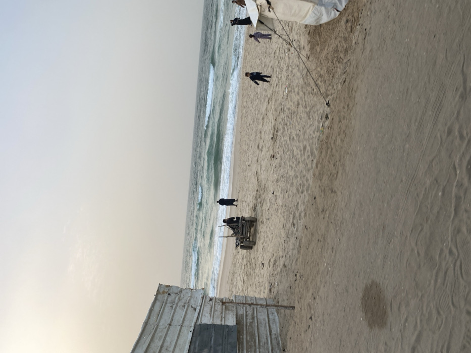 A beach scene features people positioned along the shoreline. Some individuals are near the water's edge, while others are further up the beach, near a makeshift shelter and a cart. Waves break gently on the sand. The sky is overcast and grey, providing a muted backdrop to the scene.