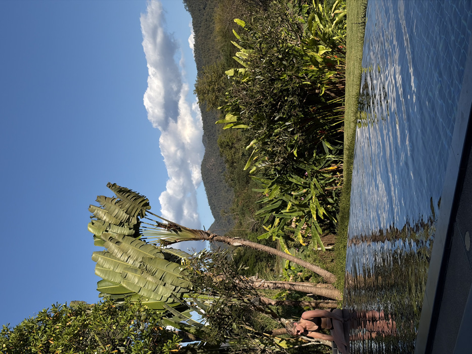 A female individual with blonde hair, attired in a dark two-piece swimsuit and sunglasses, is seated on the dark-tiled edge of an infinity-edge swimming pool. Her lower legs are submerged in the water, and her reflection is visible on the rippled surface. The immediate environment consists of dense tropical foliage, including a prominent fan-leaved tree, resembling a Traveler's Palm, on the left, and various green shrubs and broad-leafed plants along the pool's edge. In the background, rolling, forested mountains are visible beneath a clear blue sky with scattered cumulus clouds. The scene is illuminated by natural sunlight, indicating an outdoor setting in the city of Pai, Thailand.