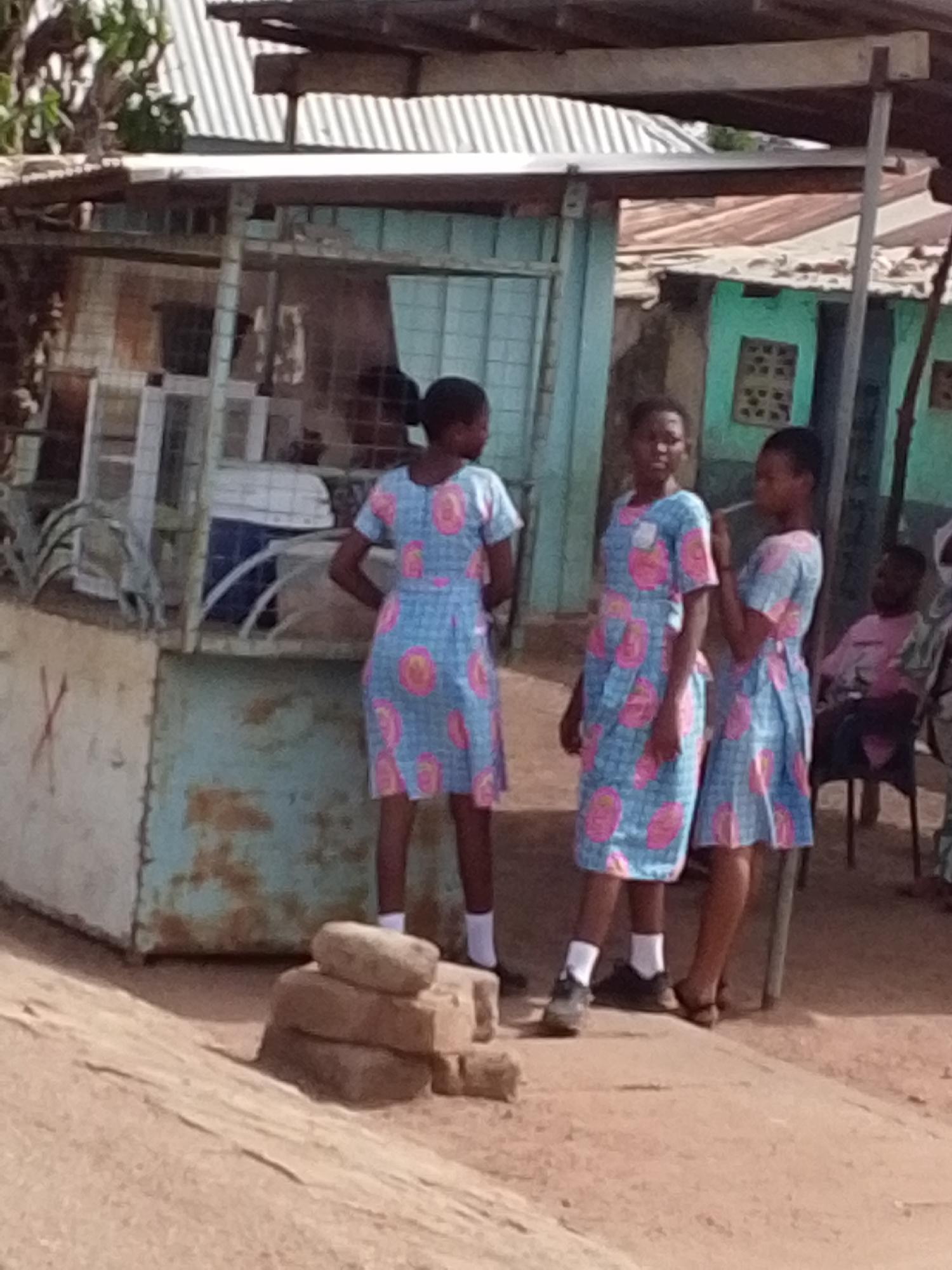 Three young women wearing identical light blue dresses with a pink and dark blue floral pattern are the focal point of the image. They are standing in front of a weathered, light blue shack with metal roofing, likely in a residential area. The woman on the left is seen from the back, while the other two are facing right. All three have dark hair, possibly in short styles. One wears white socks, while the others do not. One has sneakers and the others have brown sandals. To the left of the women is a stack of several stones. In the background to the right, a man is seated on a black chair. Buildings are scattered in the background and the ground is dirt. Considering the subjects and general look of the environment, this image appears to be captured in a residential district in the city of Tamale, Ghana.