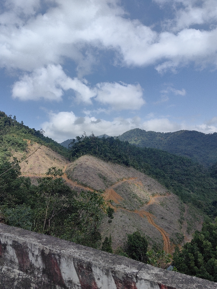 The image displays a mountainous landscape in the vicinity of Huế, Vietnam, under a blue sky with scattered white cumulus clouds. In the foreground, a weathered concrete barrier, marked with faded white and reddish-brown diagonal stripes, extends across the lower portion of the frame. Beyond this barrier, the terrain drops and then rises into a series of hills. The midground features a prominent hillside that has been extensively deforested, exposing large areas of reddish-brown soil and sparse, dry, light-colored vegetation. Several winding dirt tracks are visible traversing this cleared slope. Adjacent to and behind the deforested area, other hills and distant mountains remain covered in dense, dark green tropical forest. No individuals or man-made structures other than the barrier and dirt tracks are present.
