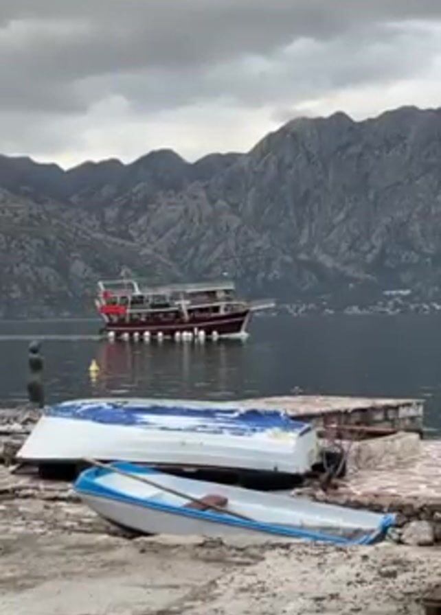 The scene depicts a body of water with mountains in the background under a cloudy sky. A maroon and white boat is sailing on the water. In the foreground, there are two small boats, one turned upside down, lying on a pier constructed from light-colored stone.