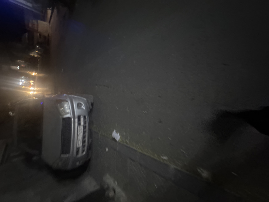 The image depicts a nighttime street scene in At-Tall, Syria. A silver-colored SUV or crossover vehicle is parked on the left side of a dark, paved road, facing away from the viewer. The vehicle's front bumper, dark grille, and headlights are visible. A license plate, appearing to be Syrian in format with Arabic script and numerals, is mounted on the front bumper. The vehicle is positioned alongside a dark, indistinct wall or building, with its front right tire partially on a narrow, elevated curb or sidewalk. Scattered light-colored debris and some sparse organic material are present on the ground near the vehicle and curb. The paved road surface is dark, with a prominent dark shadow, consistent with that of a standing person (the photographer), occupying the lower right foreground. In the background, the street recedes into darkness, illuminated by multiple blurred yellow and white lights, suggesting the presence of other vehicles or distant streetlights. Buildings or structures are dimly visible on both sides of the street in the far distance. No individuals are directly visible in the frame.