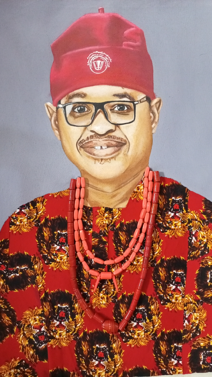 A painted portrait depicts a smiling adult male from the chest up, against a plain light grey background
