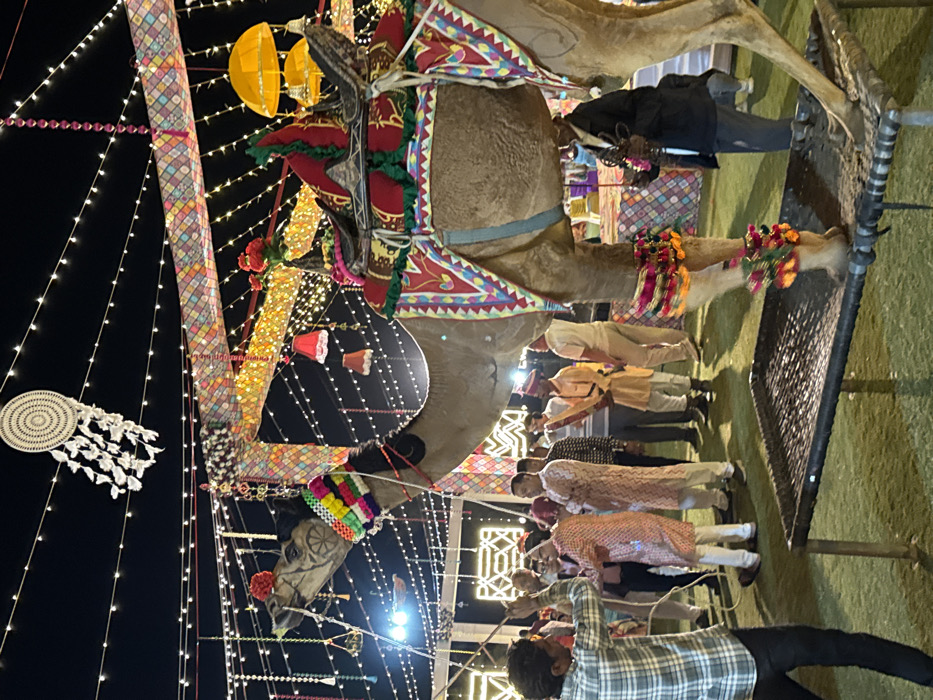 A decorated camel stands on a platform surrounded by people dressed in traditional Indian attire. The camel is adorned with colorful ornaments and a saddle. String lights and decorative structures illuminate the night sky. People stand in line, seemingly admiring or interacting with the camel. The scene suggests a cultural event or festival.
