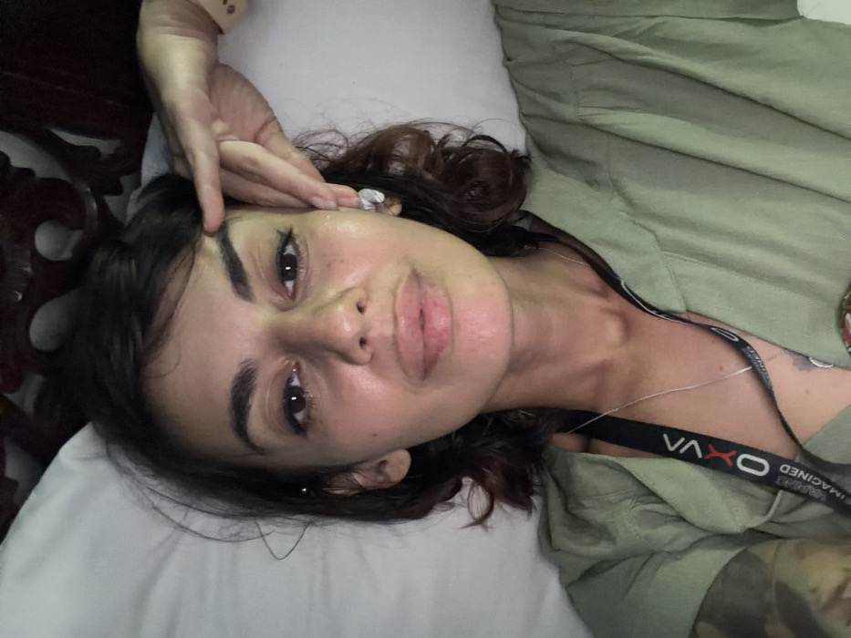 A female individual with medium-dark skin, dark wavy hair, and dark eyes is depicted in a close-up, upward-facing shot. She is lying on a white pillow on a bed with white bedding. Her right hand is raised, with fingers touching her right eyebrow area. She wears a light olive green collared shirt, partially open, revealing a black undergarment strap. A black lanyard with white text reading "VAXVA IMAGINED" is visible around her neck, along with a thin silver chain. A partial tattoo is visible on her left arm. She has an earring in her right ear and a small silver stud piercing on the upper helix of her left ear. Behind her head, a dark brown wooden headboard with carved details is partially visible. The specific location within the city of Bangle, Indonesia, cannot be determined from the visual information present in the image.