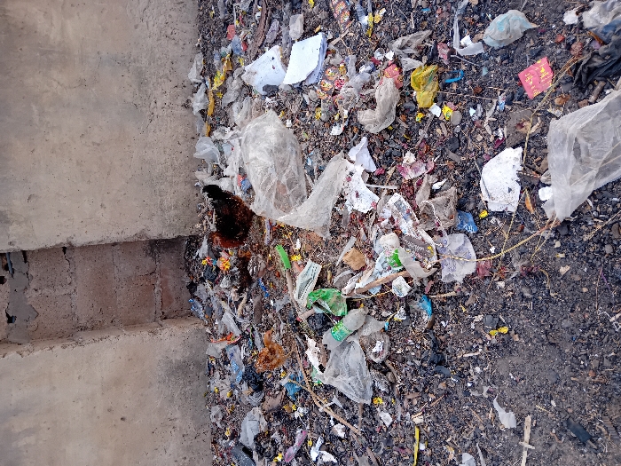 A chicken forages amidst a pile of scattered trash. The debris includes plastic bags, paper scraps, and other unidentifiable refuse. The chicken is predominantly brown with some black feathers. The ground is littered with dark soil and small stones mixed with the trash. A concrete structure borders the left side of the scene, showing signs of weathering and age. The overall scene depicts environmental pollution and the presence of wildlife in an urban or rural setting.