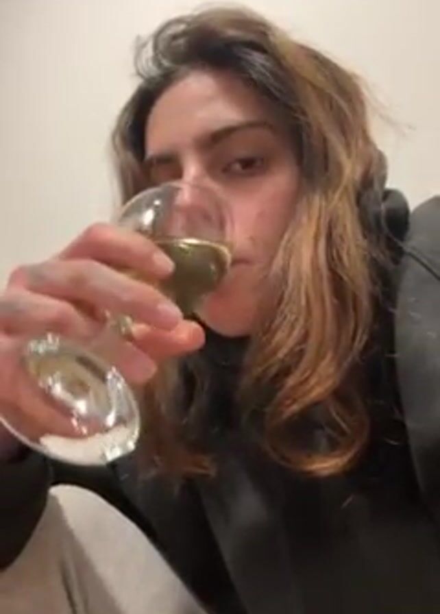 A person with light brown hair, wearing a dark hoodie and gray sweatpants, sits on a floor with a white wall behind them. They are holding a wine glass filled with a light-colored liquid, possibly white wine, and taking a sip. The camera is positioned close to their face, creating a somewhat shaky, first-person perspective.
