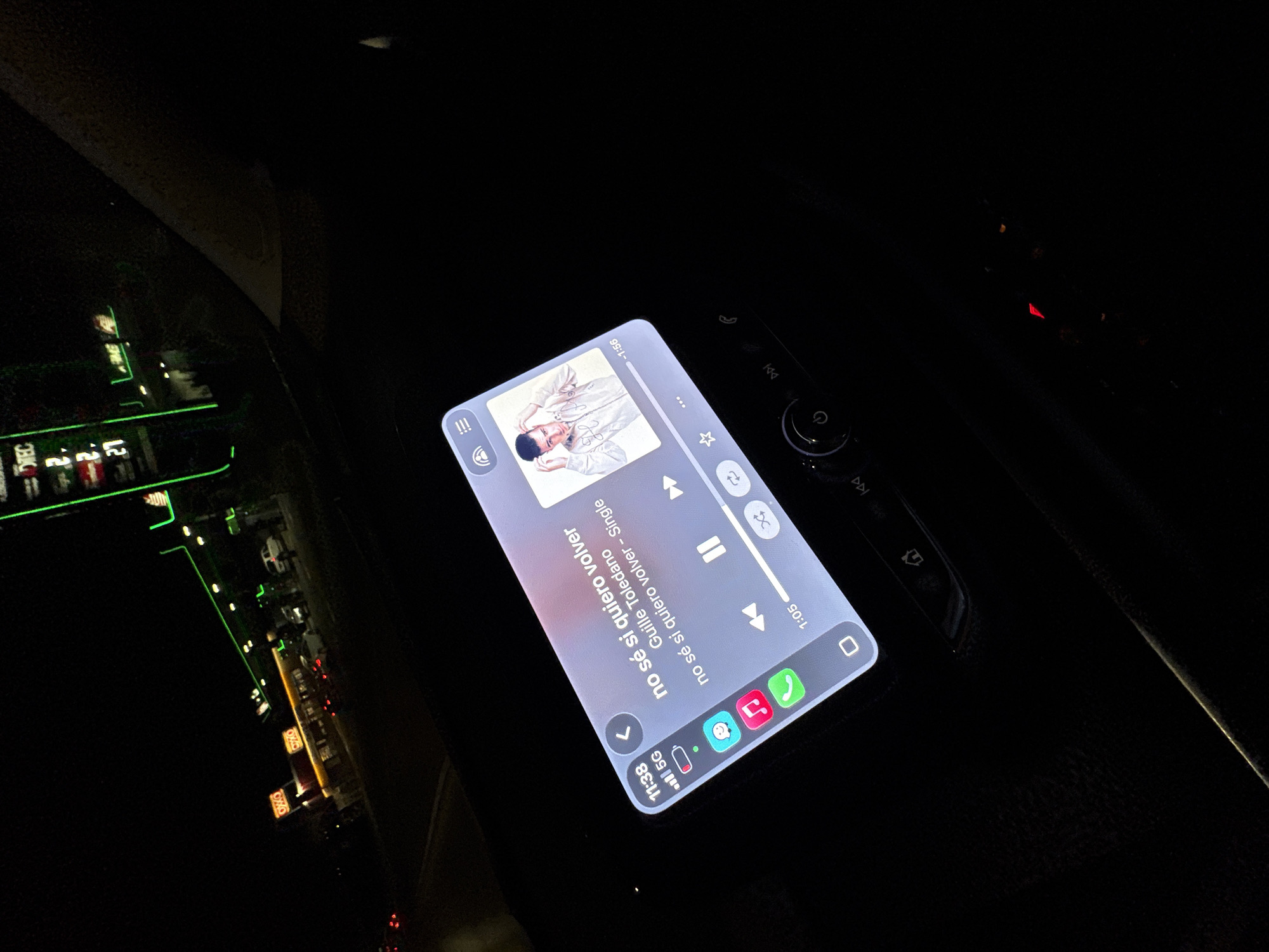 Here is a forensic description of the image: The image is taken from inside a vehicle at night. The primary focus is a smartphone displaying a music player interface. The song playing is "no sé si quiero volver" by Guille Toledano. The phone shows a full 5G connection and a low battery. Car controls are visible to the right of the phone. Through the windshield, the night scene reveals a brightly lit convenience store, possibly a "DITEC" or "OXO" store. Based on the available information, the general location is presumed to be San Bernardino Tlaxcalancingo, Mexico.