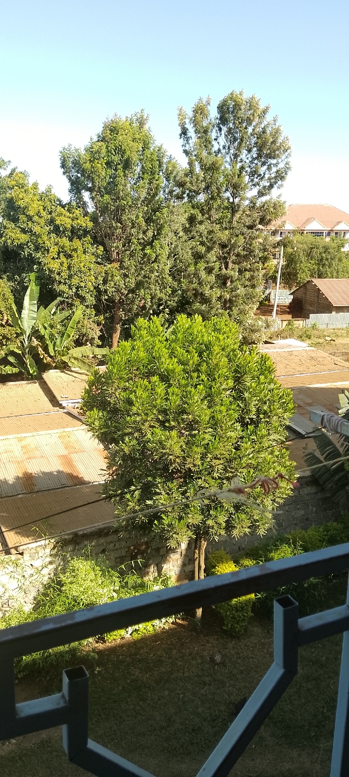 The image presents an elevated outdoor view within Karingani ward, Kenya, under a clear blue sky. A dark metal railing with geometric patterns is visible in the foreground, suggesting a balcony or window vantage point. Directly below the railing, a green lawn transitions into a stone retaining wall partially covered by dense green foliage. In the midground, a prominent, bushy green tree stands centrally. To its left, several large-leafed banana plants are visible. Behind these, two structures with rusty brown corrugated metal roofs are discernible. To the right of the central tree, a horizontal clothesline or utility line stretches, with light-colored material draped over it. A small, light-colored animal is indistinctly visible on a dirt patch in the upper right midground. The background is characterized by numerous tall green trees. Above the tree line on the far right, a multi-story building with a reddish-brown tiled roof and light-colored walls is partially visible. Adjacent to it, a utility pole stands. Further right, a single-story building with a reddish-brown corrugated roof and light-colored block walls is present, bordered by a light-colored fence. No individuals or specific actions are discernible within the frame.