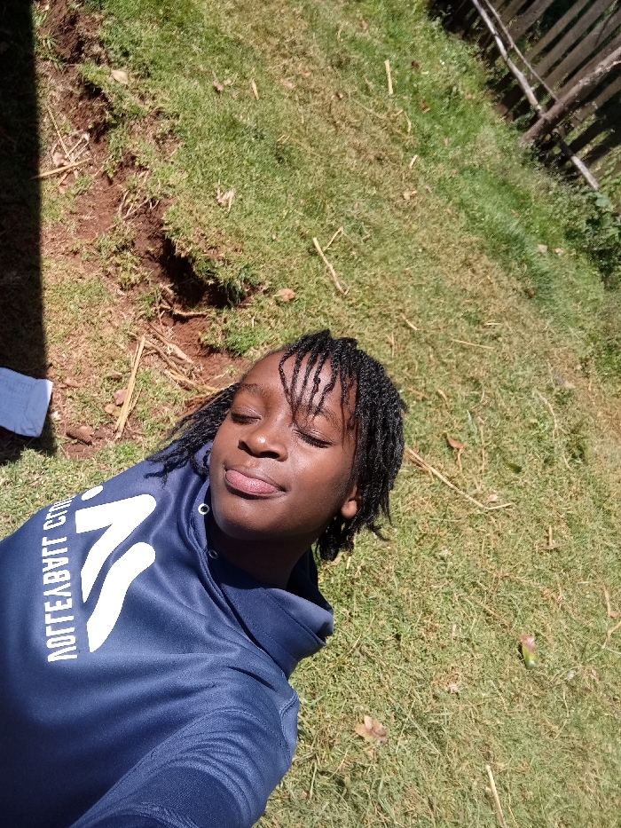 A single individual is depicted lying on their back outdoors in Waseges ward, Kenya, with the camera positioned directly above, capturing a selfie. The person, a young individual with dark skin and short, dark braids partially covering the forehead, wears a dark blue long-sleeved hooded sweatshirt featuring a white, mirrored graphic on the left chest ("AOTTELRVT C" partially legible). Their eyes are closed, and lips are slightly parted in a relaxed expression. The background consists of green grass with visible patches of reddish-brown soil and scattered dried plant material. A dark wooden fence is visible in the upper right background, and sunlight illuminates the scene, casting a dark shadow in the upper left corner, where a piece of light blue fabric is also partially visible.