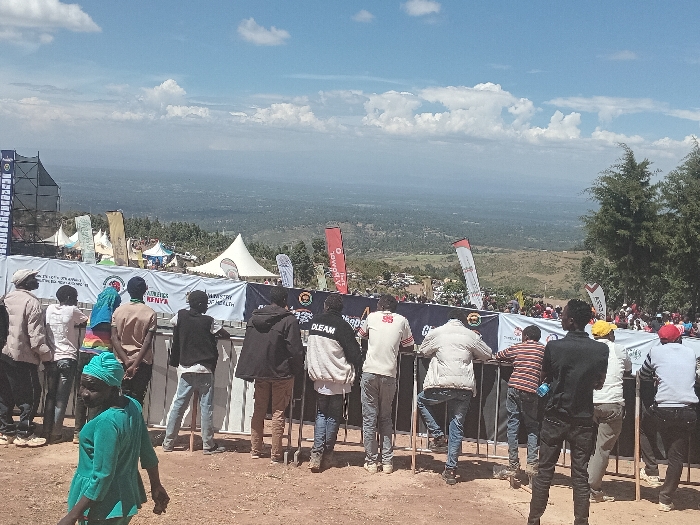 The image depicts an outdoor public gathering in Ngenyilel ward, Kenya, characterized by an elevated viewpoint overlooking a vast landscape. The foreground features a reddish-brown dirt ground with a dark metal crowd barrier spanning horizontally. Approximately a dozen individuals, predominantly male, are positioned behind this barrier, observing a scene beyond. Most are leaning on the barrier, facing away from the viewer. One woman, dressed in a teal head covering and matching top, walks across the immediate foreground from left to right. Behind the barrier, a large white banner displays "ATHLETICS KENYA" and "MINISTRY OF HEALTH" logos and text. Multiple event tents, including large white conical structures and smaller canopies, are visible on a slightly lower elevation. Vertical advertising flag banners with company logos, such as Safaricom, are also present. A large metal scaffolding structure, possibly a stage or platform, stands on the far left. A crowd of people is observable further back, beyond the tents and banners. The background reveals a sprawling, green, undulating landscape under a partly cloudy blue sky, extending to the horizon, with a cluster of dark green coniferous trees on the right.