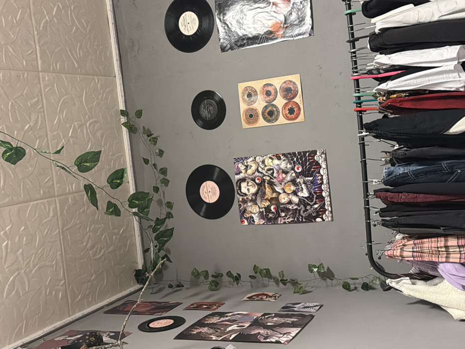 The image depicts an interior room located in Sof'ino, Russia. The room features matte gray walls and a white, textured ceiling composed of square panels. A faux ivy garland is secured along the upper wall corner, extending partially onto the ceiling. Wall decorations include multiple items: one large black vinyl record is mounted on the left wall, while two large and one smaller black vinyl record are mounted on the right wall. Several posters are also displayed. On the right wall, a prominent poster depicts numerous animated characters in a fantasy art style, consistent with the "Hunter x Hunter" series, with a border of skulls at its base. Adjacent to this, a smaller rectangular print showcases six human irises in different colors, labeled as a "Color Plate." A partially visible poster featuring a stylized figure with orange tones is situated further right. In the foreground, a black, U-shaped garment rack is visible, laden with various articles of clothing, including shirts, pants, and jackets, suspended on hangers of assorted colors. No individuals are present in the scene.