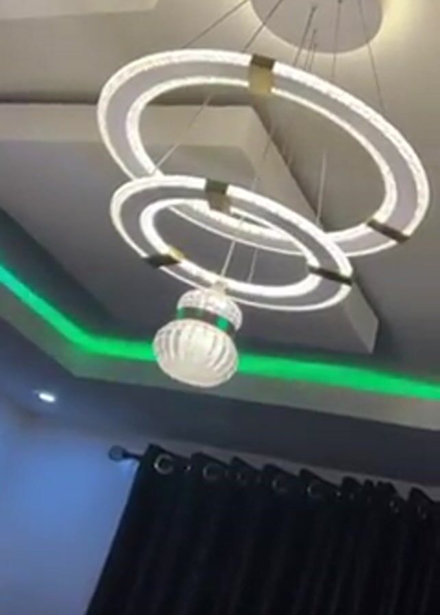 The video pans across a modern living space. The scene begins focusing on a circular chandelier that features LED lights. The lights in the room change from green to red. Next the camera pans upward to show a white, square recessed ceiling panel. It then pans down towards a tv, black, horizontally ribbed soundproofing wall panels, a circular lamp and decor that includes a waterfall fountain with greenery.
