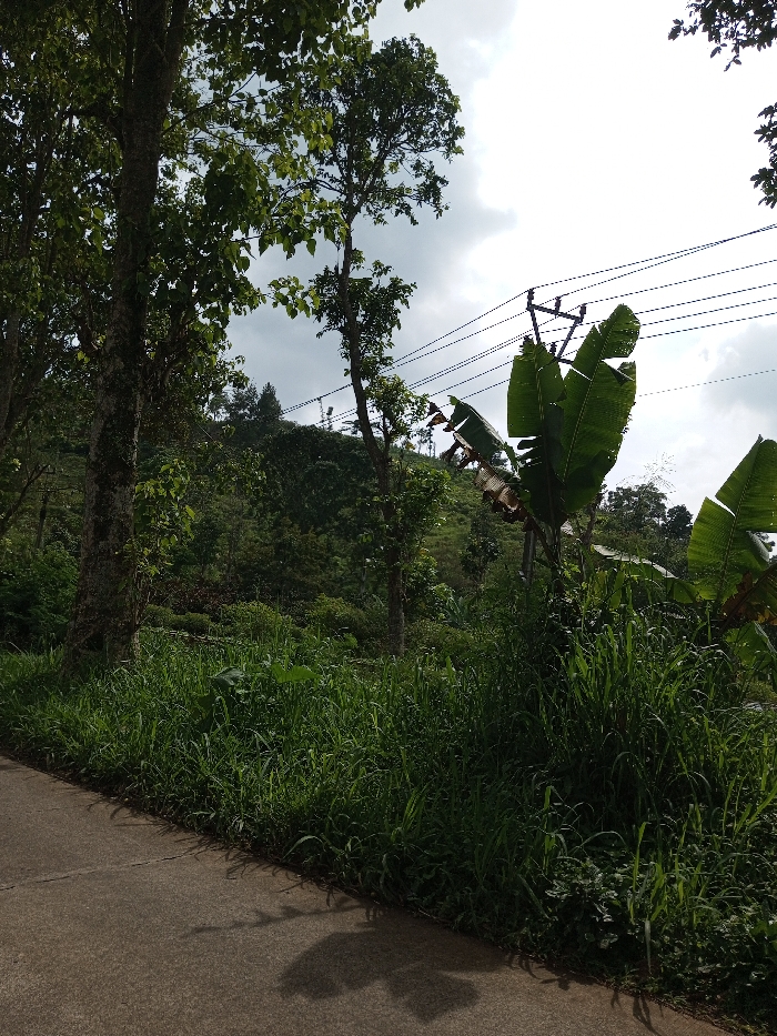 The image portrays a rural outdoor scene in Kandenuwara, Sri Lanka, under a sky with scattered gray and white clouds. A concrete or asphalt pathway occupies the lower-left portion of the frame, running diagonally upwards and exhibiting distinct, dark shadows from overhead foliage. To the right of this pathway, the ground is covered with dense, tall green grass and assorted vegetation. Further right, large, somewhat tattered green banana leaves are prominent, partially obscuring a wooden utility pole with multiple dark power lines extending horizontally across the upper-right quadrant. The background features a steep, verdant hillside densely covered with trees and other green plant life, consistent with a cultivated or natural forest landscape. No individuals or specific activities are observed.