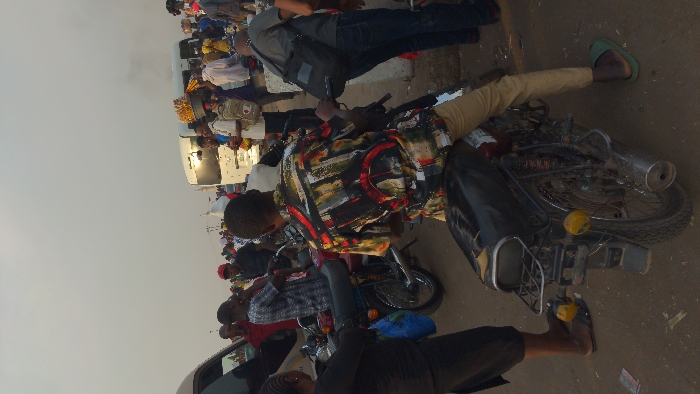This image depicts a congested outdoor urban environment, consistent with a market or transportation hub, located in Nyanya, Nigeria