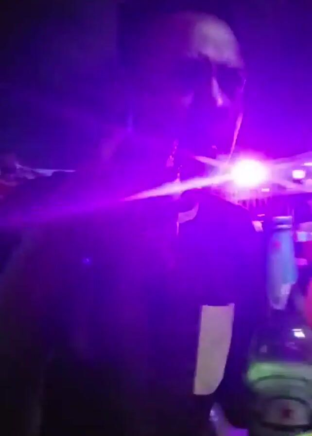 A person, possibly male, is standing in a dimly lit area with flashing lights of various colors