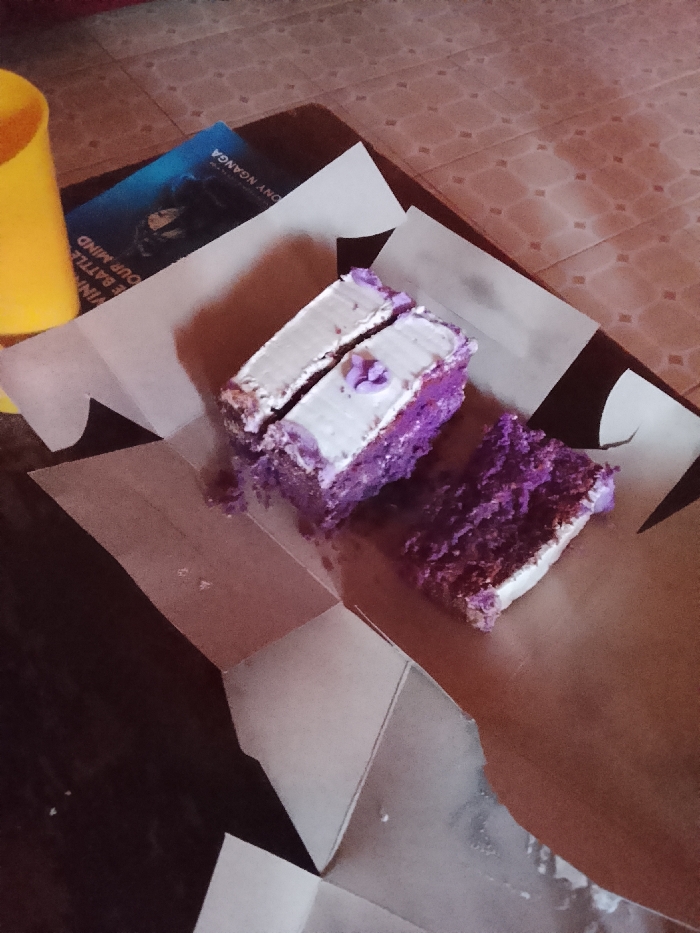Three slices of Ube cake sit in a cardboard box on a table. The cake is layered, with a white frosting and a small purple flower decoration on one slice. A yellow cup and a blue book, whose title has words "WIN BATTLE" and "OUR MIND," are visible near the box. The table's surface appears to be tiled.