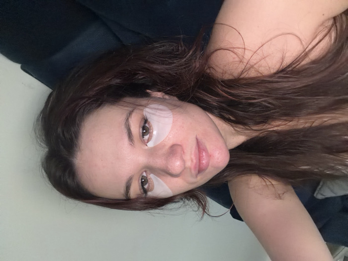 The image displays a single individual, appearing female, positioned on a dark blue or black upholstered surface, likely a couch or bed. The subject has long, dark brown hair with reddish undertones, which is spread across the surface. Her head is angled slightly, and she is looking directly into the camera. White, crescent-shaped eye patches are applied beneath each eye. Her complexion is fair, with visible skin texture and slightly parted lips. Her left arm is raised, with the upper arm and shoulder visible, suggesting she is holding a device to capture a selfie. A partially visible gray patterned pillow is behind her head on the left. The background consists of a plain, light-colored wall, appearing pale green or off-white. The specific location within the city of Belgrade, Serbia, cannot be determined from the visual information presented in the image.