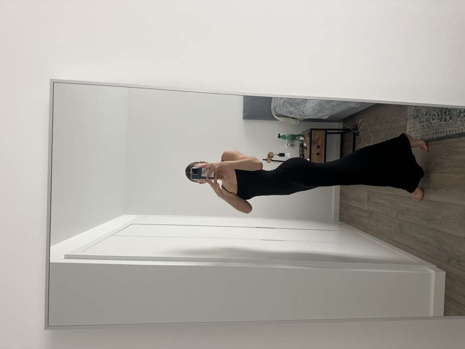 An individual is depicted taking a mirror selfie in an indoor room located in Ericeira, Portugal. The person is standing barefoot, wearing a form-fitting black sleeveless maxi dress with spaghetti straps. They are positioned facing slightly to the left, with their right arm raised, holding a smartphone with a light-colored case that obscures their face, capturing their reflection in a large, rectangular full-length mirror. The mirror has a thin, light-colored frame. The environment reflected in the mirror includes a modern bedroom setting. To the left, a white built-in wardrobe with multiple flat-panel doors is visible. To the right, behind the individual, a wooden bedside table with two drawers supports a dark-colored lamp featuring an exposed bulb and a green bottle. A bed with a grey upholstered headboard and a grey and white patterned duvet is partially visible behind the bedside table. The room features plain white walls and light brown wooden plank flooring. A small, patterned rug lies on the floor near the bed.