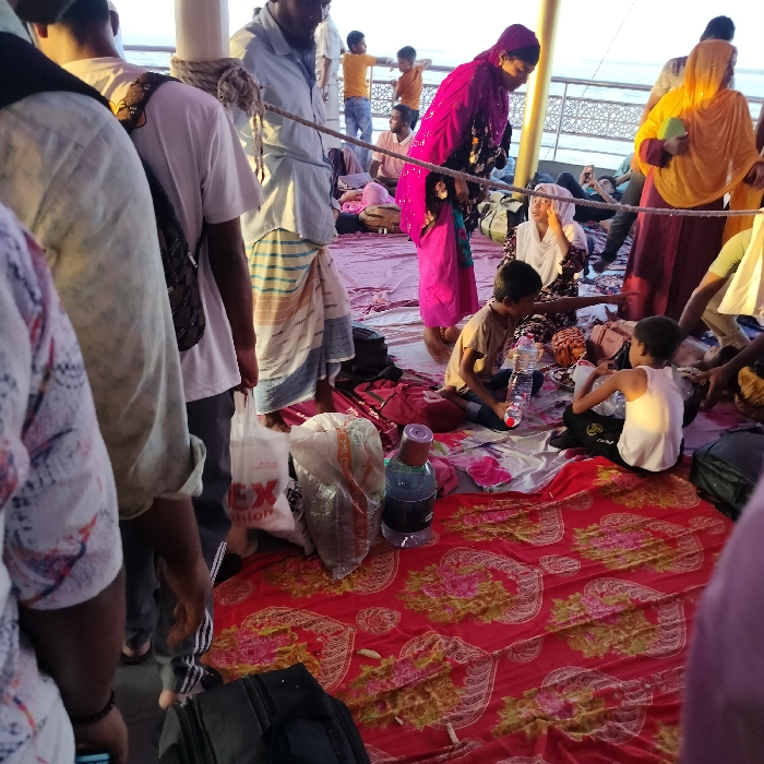 A diverse group of people occupy a space, possibly a boat deck, covered with a red patterned blanket. Two young boys sit on the blanket, engaged in an activity with bottles. Adults stand or sit around, some wearing traditional clothing like saris and lungis. A white pillar is visible, secured with rope, and luggage items are scattered around. Some individuals are looking at the distant view, while others seem focused on their immediate surroundings.