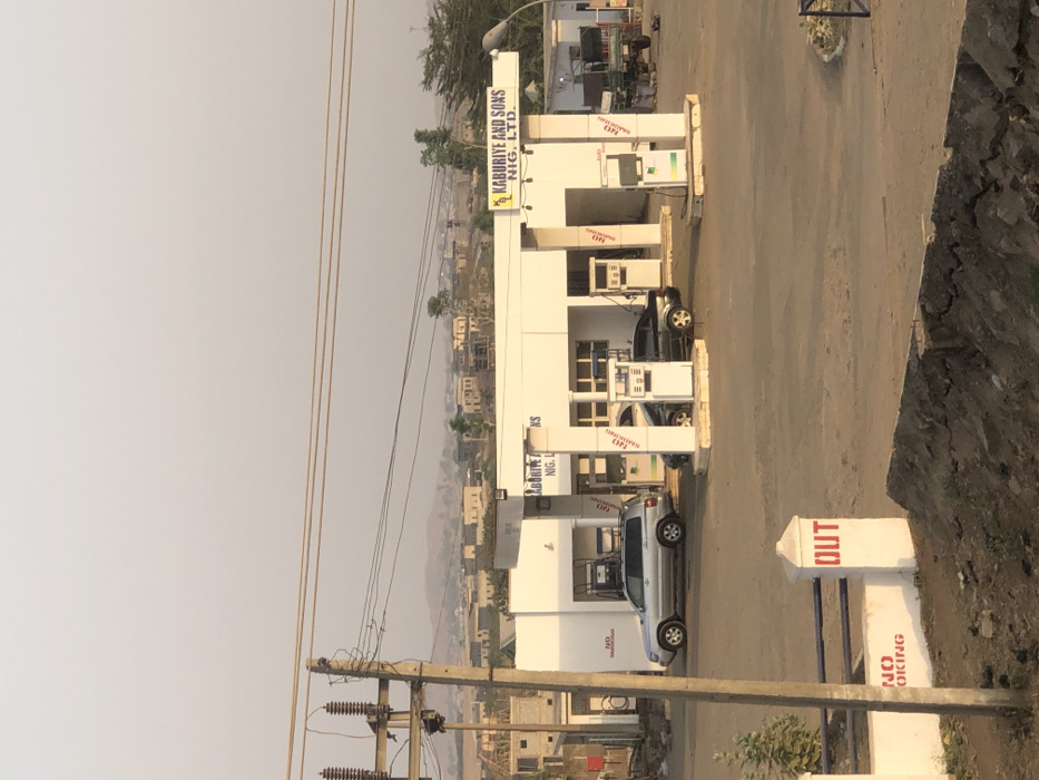 A roadside gas station with white structures and multiple gas pumps. Several cars are parked, and a sign reading "OUT" is visible with "NO SMOKING" printed below. The station’s sign reads "KABURIYE AND SONS NIG. LTD.". Utility poles with power lines run along the side of the street, while a hazy landscape with buildings and mountains extends in the background. The scene is angled, capturing a portion of a dirt road on the right edge of the frame.