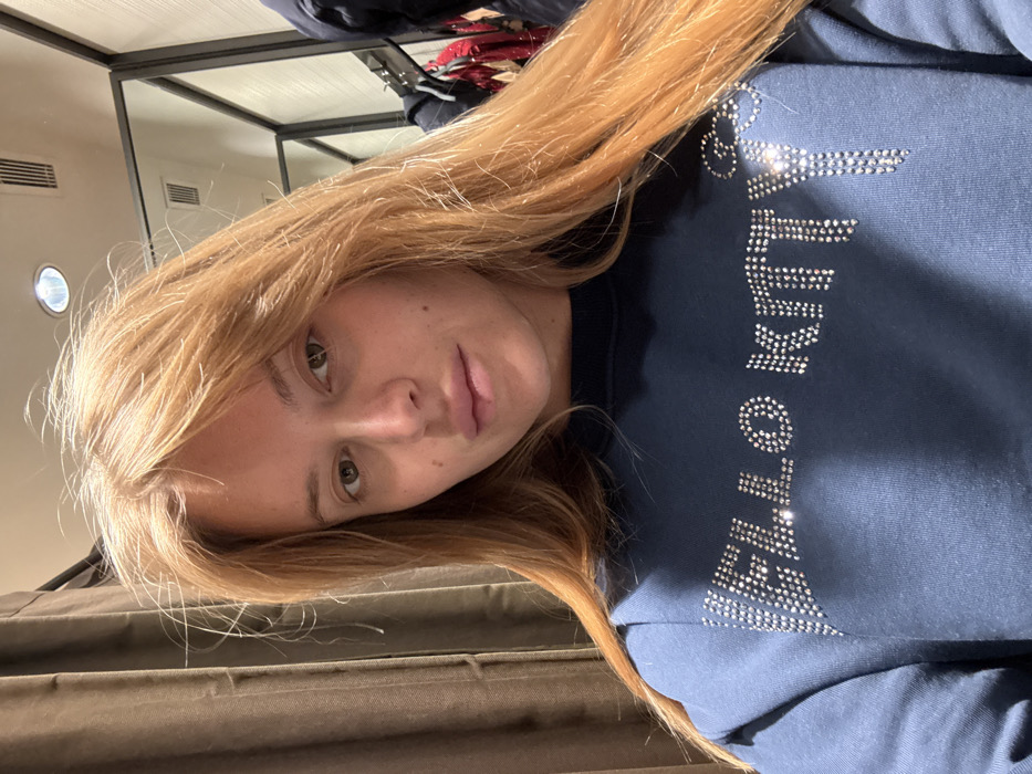 A young woman with light brown hair and fair skin looks at the camera. She wears a blue top with silver rhinestones forming the word "VICTORIA". The background is a department store fitting room, with a metal rack visible in the upper left and beige curtains below. The image is slightly tilted, with the woman's head angled.