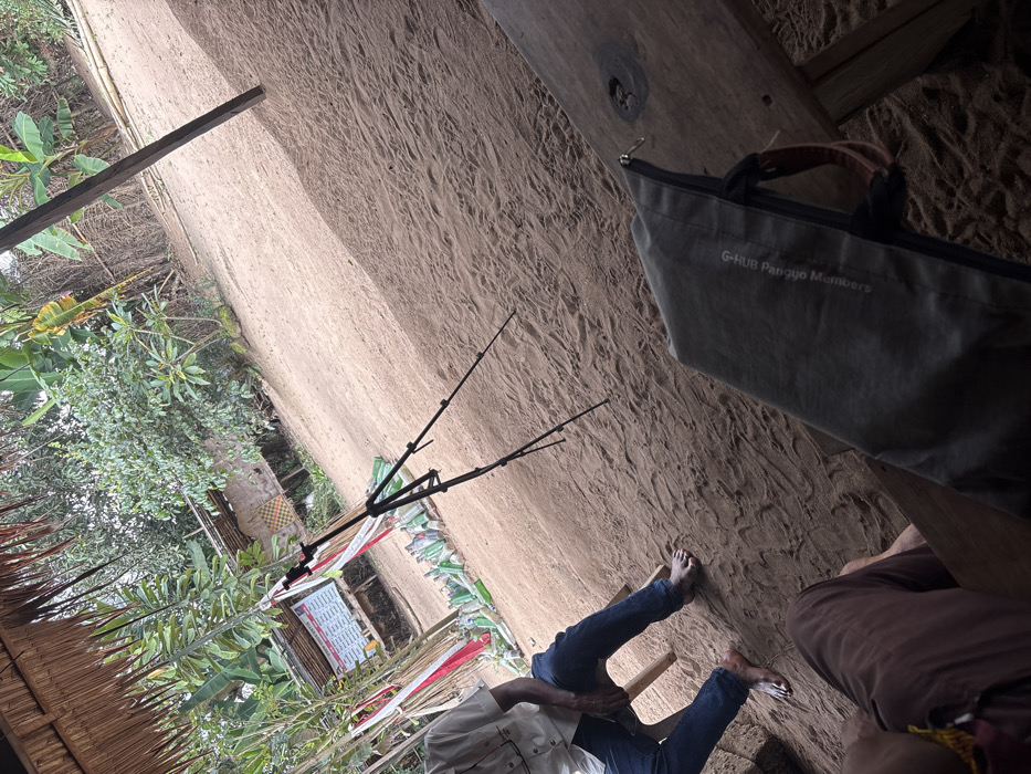 The scene depicts an outdoor sandy area in Uyo, Nigeria, under a thatched roof structure supported by a dark wooden beam visible on the right. In the immediate foreground on the right, a weathered wooden bench or table hosts a grey canvas bag with "G-Hub Pangyo Members" printed vertically on its side, partially unzipped. To the left, a male subject is seated on a low, light-colored chair, visible from the torso down. He wears a light-colored short-sleeved collared shirt and blue jeans, with both bare feet resting on the sandy ground. His left hand is positioned as if holding a dark object. In the mid-ground, a black tripod stands upright on the sand, oriented towards a rustic shelter. This shelter, constructed with natural materials and a thatched roof, features a white sign with dark text in multiple rows, details illegible, and a woven mat decoration on its side. In front of the shelter, a line of clear and green glass bottles is arranged horizontally on the sand. Several long, thin wooden poles, some adorned with strips of red and white fabric, lean against structures near the shelter. The background behind the shelter and bottles consists of lush tropical vegetation, including banana plants and various trees. The sandy ground exhibits footprints and uneven textures. Another individual, wearing brown trousers, is partially visible in the bottom-left foreground, likely seated near the photographer.