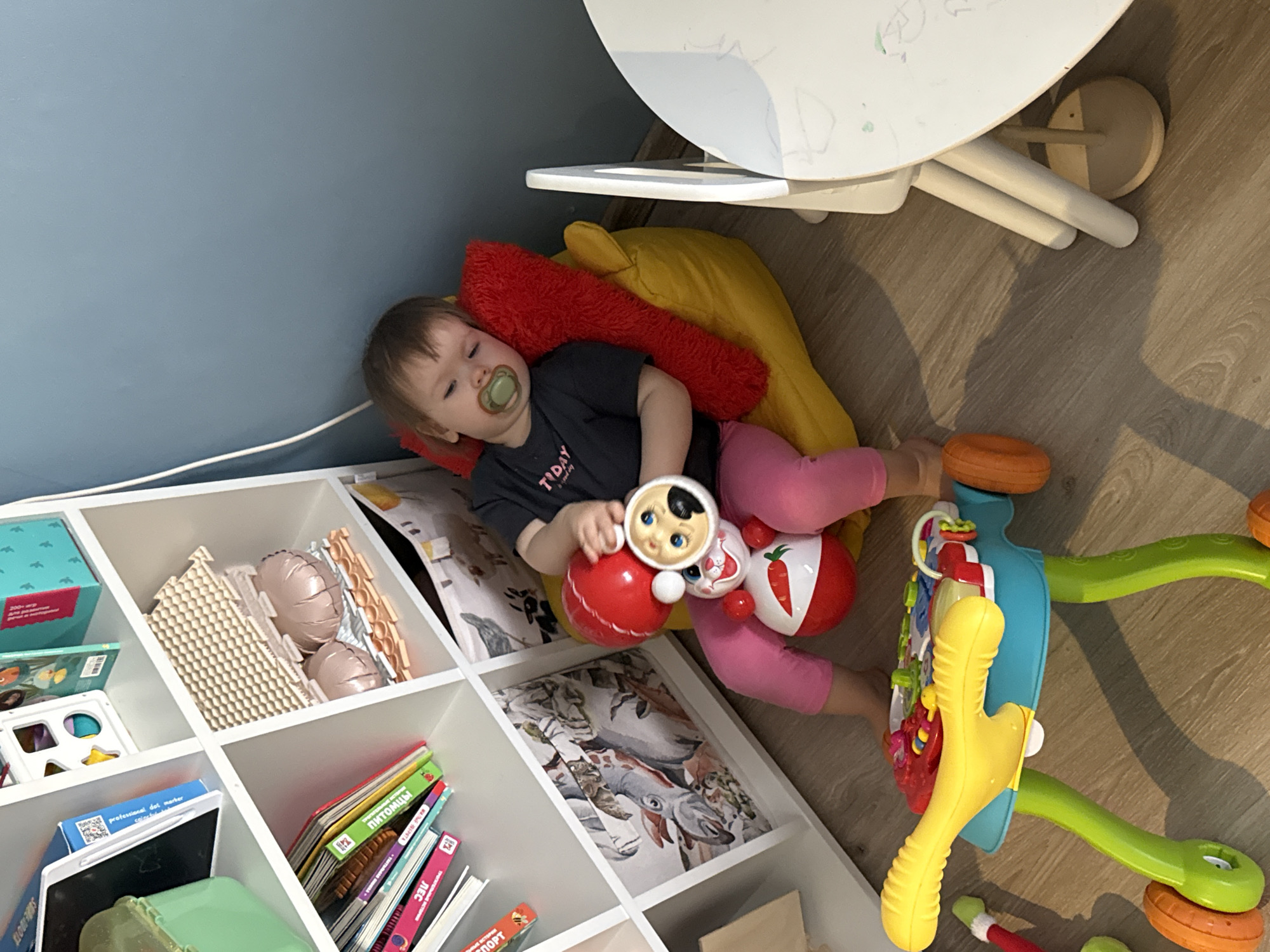 A child is lying on the floor next to a white shelving unit, positioned near a light blue wall and a wooden floor. The child has a pacifier in their mouth and is holding a toy with a face on it. They are also surrounded by pillows, and a yellow and red plush toy. Beside the child is a walker toy. A white table with drawings on it is also in the frame. There is no explicit information to indicate that the image was taken in Moscow, Russia.