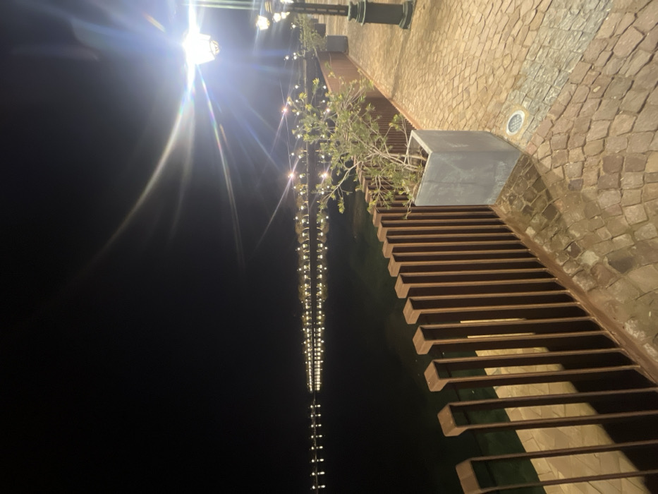 - "A nighttime scene shows a waterfront walkway lined with potted trees adorned with string lights" by FM-ZQQC92, licensed under CC BY 4.0